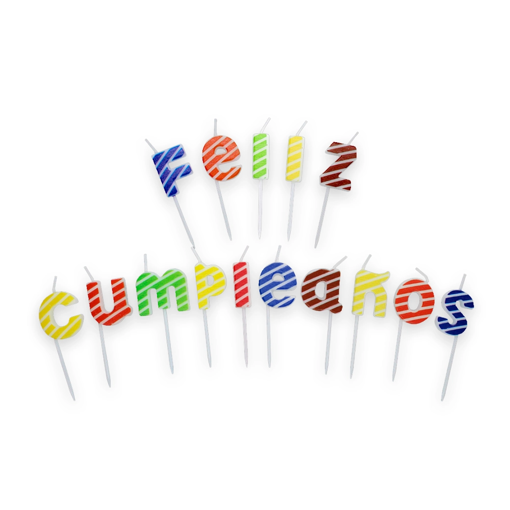 / Vela Macivelas Letras “Feliz Cumpleaños” Colores Rayadas (15 pzas)